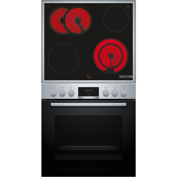 Bijzondere kenmerken | Oven: Bediening met led-display, elektronische klok, optische verwarmingsregeling, automatische start, aluminium ovengreep, snelverwarming, halogeen binnenverlichting, koelventilator. Kookplaat: Braadzone, kookzone met twee circuits, rondom roestvrijstalen frame. |